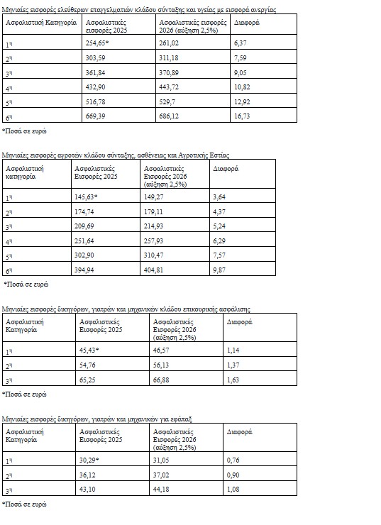Δείτε αναλυτικά πώς αναμένεται να διαμορφωθούν οι ασφαλιστικές εισφορές των ελεύθερων επαγγελματιών, αγροτών και επιστημόνων (δικηγόροι, γιατροί, μηχανικοί) για το 2026: