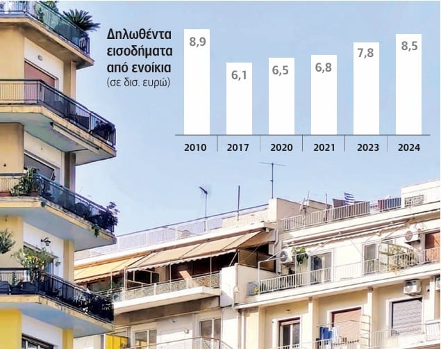 To μεγαλύτερο ποσό που έχει δηλωθεί μέχρι τώρα ως εισόδημα από ενοίκια είναι τα 8,887 δισ. ευρώ που καταγράφηκαν το 2010, αποτυπώνοντας τα εισοδήματα της τελευταίας χρονιάς πριν από το ξέσπασμα της οικονομικής κρίσης. Ακολούθησε η μείωση των εισοδημάτων, που μας έφερε μέχρι και το χαμηλό δεκαετιών των 6,1 δισ. ευρώ το 2017, ενώ έκτοτε υπήρξε αύξηση, αλλά με αργό ρυθμό: 6,47 δισ. ευρώ το 2020 εν μέσω πανδημίας, 6,76 δισ. ευρώ το 2021, χρονιά κατά την οποία κυριάρχησε και η επιστροφή ενοικίων. Το 2023 υπήρξε σημαντική άνοδος στα 7,85 δισ. ευρώ, ενώ το 2024 βρεθήκαμε μια ανάσα από το ιστορικό υψηλό με επίδοση της τάξεως των 8,5 δισ. ευρώ. Είναι πολύ πιθανό ότι μόλις δοθούν στη δημοσιότητα τα αναλυτικά στοιχεία από τις φορολογικές δηλώσεις του 2025 (εισοδήματα 2024), θα έχουμε το νέο ιστορικό υψηλό, όμως και πάλι το όριο των 10 δισ. ευρώ δεν έχει σπάσει.