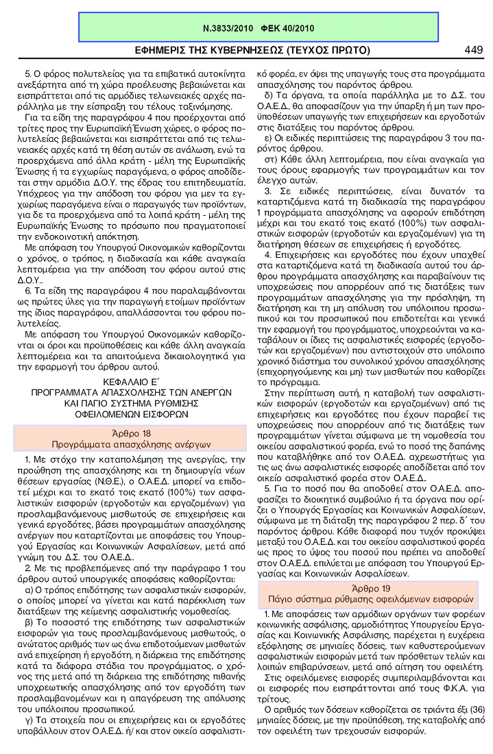 Σας κοινοποιούμε τις διατάξεις του άρθρου 18 Ν.3833/2010 (ΦΕΚ 40/τ.Α΄/2010) καθώς επίσης και των με αριθ. 6248/244/31-3-2010, 6251/245/31- 3-2010 (ΦΕΚ 364/τ.Β΄/2010), 6421/251/19-4-2010 (ΦΕΚ 474/τ.Β΄/2010) ΚΥΑ και θέτουμε υπόψη σας τα εξής :