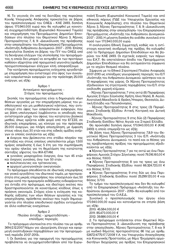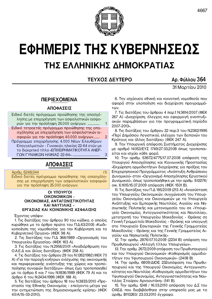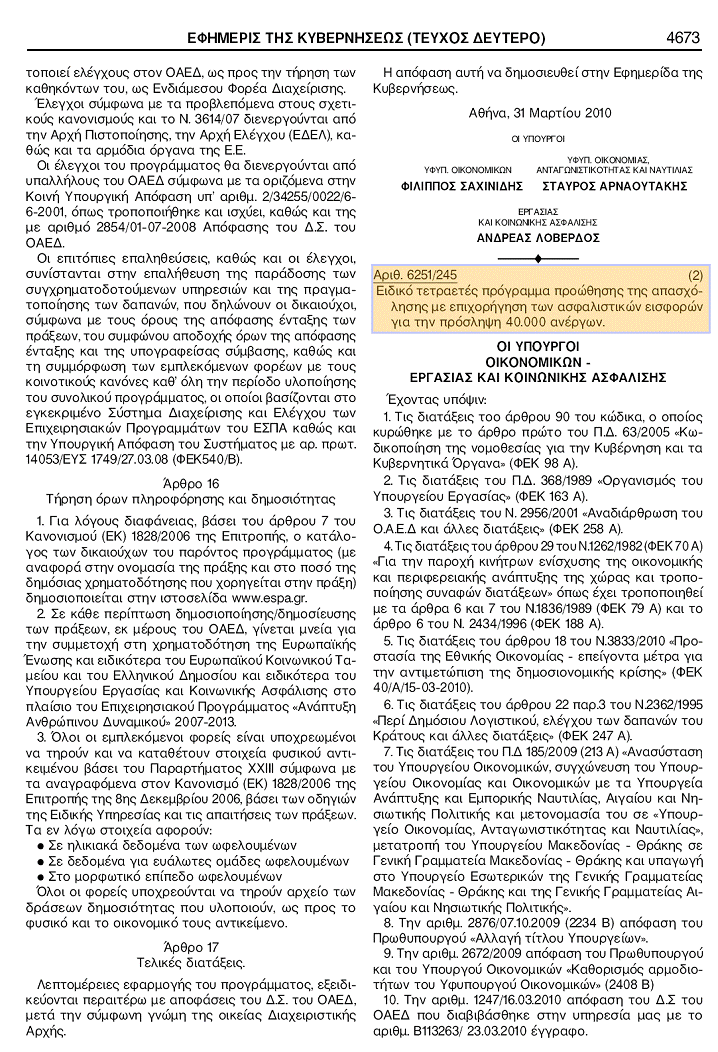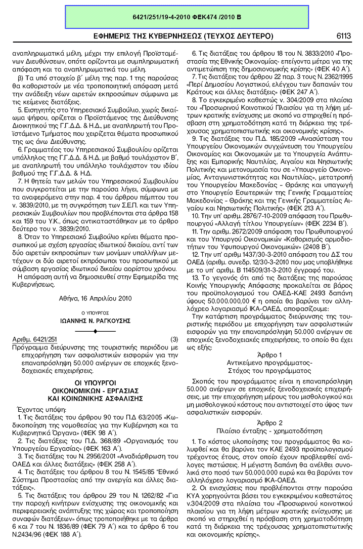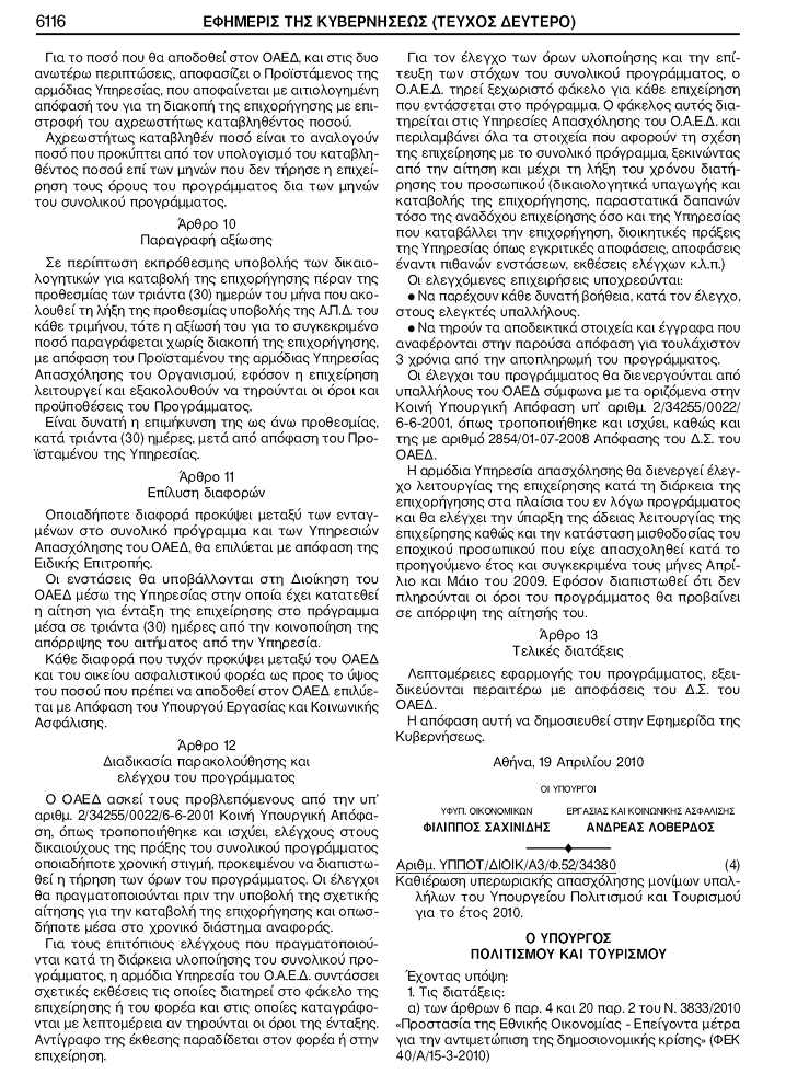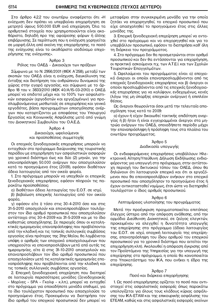 Κατ΄ εξουσιοδότηση του Ν.3833/2010 περί : «προστασίας της εθνικής οικονομίας – επείγοντα μέτρα για την αντιμετώπιση της δημοσιονομικής κρίσης», εκδόθηκαν οι σχετικές Κοινές Υπουργικές Αποφάσεις που αφορούν προγράμματα ενίσχυσης εργοδοτών με επιχορήγηση ασφαλιστικών εισφορών. Σκοπός των προγραμμάτων αυτών είναι η καταπολέμηση της ανεργίας με τη δημιουργία νέων θέσεων εργασίας και την επαναπρόσληψη ανέργων ξενοδοχειακών επιχειρήσεων.