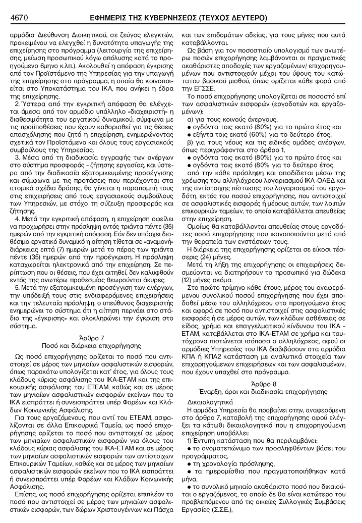 Η επιχορήγηση αφορά αποδοχές που αντιστοιχούν μέχρι το ύψος του κατώτατου βασικού μισθού, όπως ορίζεται κάθε φορά από την Ε.Γ.Σ.Σ.Ε. καθώς και στα δώρα εορτών (Χριστουγέννων – Πάσχα) και το επίδομα αδείας. Το ποσό επιχορήγησης υπολογίζεται σε ποσοστό επί των ασφαλιστικών εισφορών (εργοδοτών και εργαζομένων):