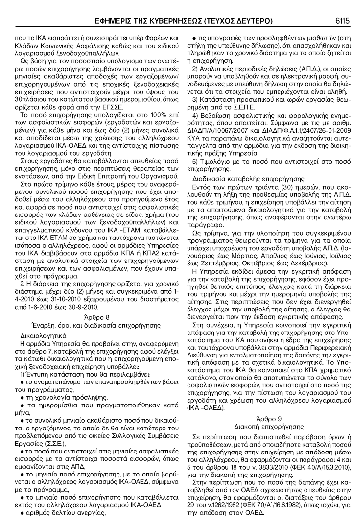 Αναφορικά με τις εισφορές που αντιστοιχούν στις αποδοχές μισθολογικών περιόδων 4ος/2010, 5ος/2010 και 6ος/2010 αποκλειστικά των επιχορηγούμενων εργαζομένων, τις οποίες υποχρεούνται να καταβάλλουν στις περιπτώσεις που έχουν ενταχθεί σε προγράμματα με επιχορήγηση ποσοστού επί των ασφαλιστικών εισφορών κάτω του 100% καθώς και σε περιπτώσεις που ο μισθός των επιχορηγούμενων εργαζομένων υπερβαίνει αυτόν που επιχορηγεί ο Ο.Α.Ε.Δ., σας γνωρίζουμε ότι θα θεωρηθούν εμπρόθεσμες (άνευ προσθέτων τελών) εάν πραγματοποιηθούν έως 30/9/2010.
