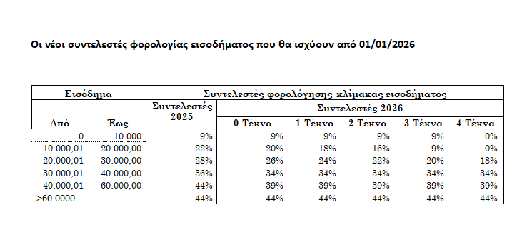 Οι αλλαγές στην κλίμακα εισοδήματος θα εφαρμοστούν από το φορολογικό έτος 2026, που σημαίνει ότι οι μισθωτοί του δημόσιου και ιδιωτικού τομέα όπως και οι συνταξιούχοι θα δουν την ωφέλεια από τον Ιανουάριο του 2026, όταν και θα δουν την μείωση στις κρατήσεις τους.