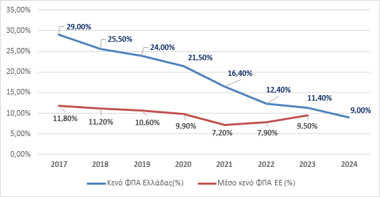 Η πτωτική τάση του κενού ΦΠΑ στην Ελλάδα συνεχίζεται, με τις προκαταρκτικές εκτιμήσεις για το 2024 να προβλέπουν περαιτέρω μείωσή του στο 9,0%.